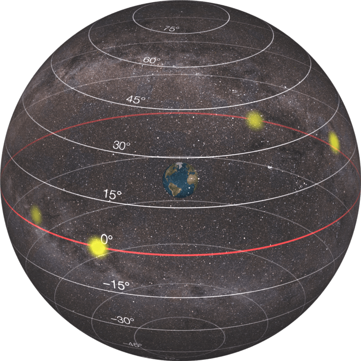 Danach wandert die Bahn der Sonne jeden Tag ein Stückchen höher, bis sie zur Sommersonnenwende mit 23.4° ihren Höchststand erreicht. In der Abbildung unten entspricht das dann einem Kreis der ungefähr zwischen dem eingezeichneten 15°-Kreis und dem eingezeichneten 30°-Kreis entspricht. (Die Gradwerte auf den Kreisen beschreiben den Winkelabstand zum Himmelsäquator, genauso wie die Breitengrade auf der Erde dem Winkelabstand zum Erdäquator entsprechen.)