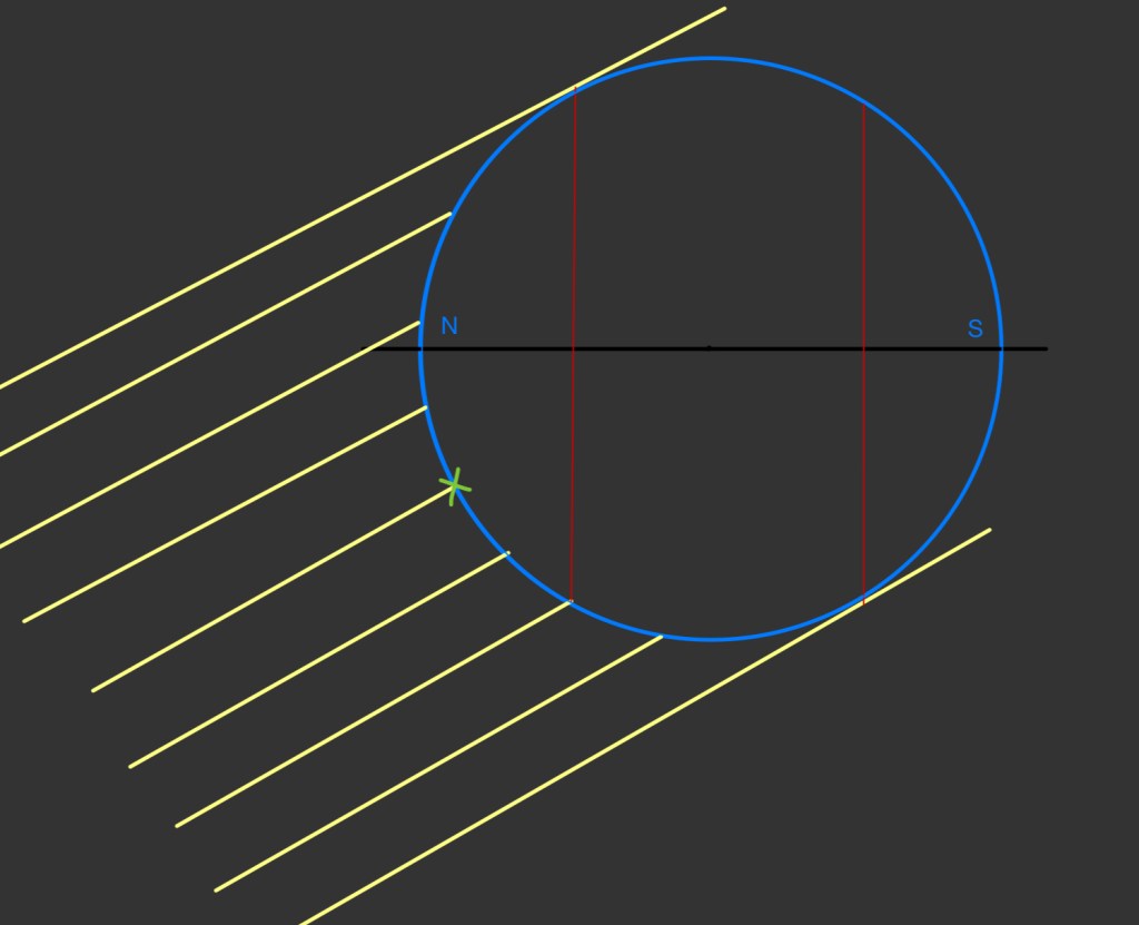 Auf der mit dem grünen Kreuz markierten Position steht die Sonne im Zenit, die Sonnenstrahlen treffen dort also Senkrecht auf die Erdoberfläche.
