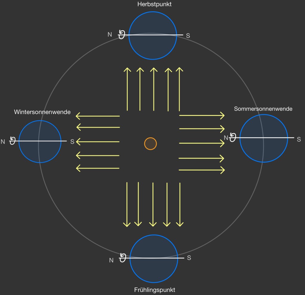 Die Erdachse ist – wie oben schon erwähnt – um circa 23.4° geneigt. Aufgrund der Drehimpulserhaltung bleibt die Ausrichtung der Drehachse gleich (wenn man es ganz genau nimmt, nur annähernd, da die Erdachse einer Präzession unterliegt, aber das passiert auf einer Zeitskala von zehntausend Jahren und kann deshalb in unserer Betrachtung vernachlässigt werden). Da sich die Erde ja aber um die Sonne bewegt, verändert sich die Ausrichtung der Erdachse relativ zur Sonne. Für den einen Teil des Jahres ist die Nordhalbkugel Richtung Sonne geneigt, für den anderen Teil des Jahres ist die südliche Südhalbkugel Richtung Sonne geneigt.